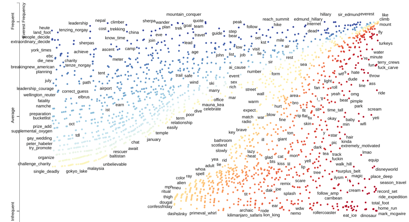 We attempted to answer these questions with novel approaches that have not been published on this data set. Considering the similar trend in the rise of social media, we evaluated the trending topics and sentiments of the twitter climbing population. We learned that the most common tweets and topics relate to early expeditions. Tweets quote Sir Edmund Hillary, discuss motivations like personal glory, and to pursue a challenge that has no tangible reward. We also observe hints at the community dynamic, where concern for climber safety is noted. Along with a mixed population of experienced and novice climbers. The tweet topics also acknowledge the danger of climbing, but with strong topics like “bucket-list” (a list of things to accomplish before death), the desire to challenge oneself is a stronger motivation than personal safety. We see this clearly in the rise of novice climbers and their community structure in the network analysis.